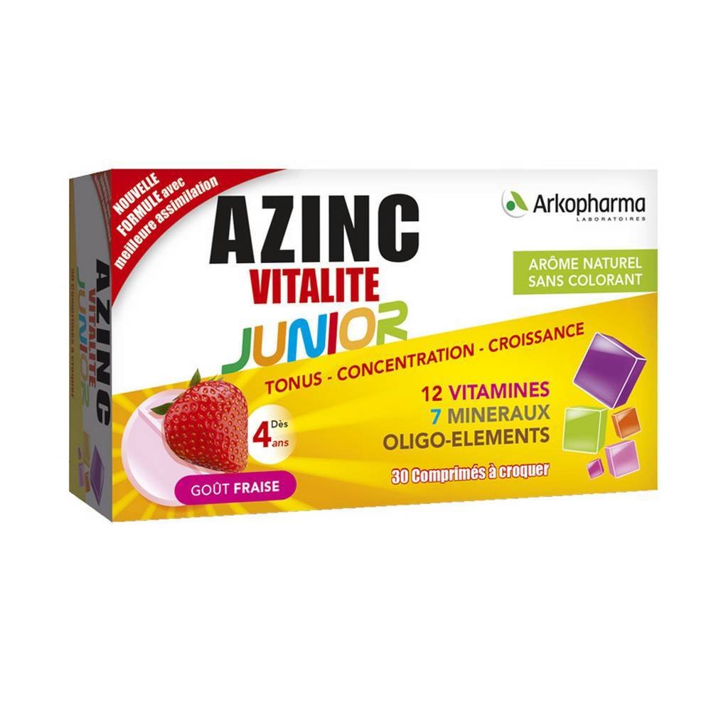 Arkopharma Azinc Vitalité Junior Goût Fraise est spécialement conçu pour apporter des vitamines, des minéraux et des oligo-éléments qui permettent d’agir sur le tonus et la résistance de l’organisme, notamment lors des périodes d’activité physique ou intellectuelle (rentrée, examens, sport ), de changement de saison ou en cas de fatigue passagère. Les vitamines et les minéraux ne peuvent pas être synthétisés par l’organisme et sont présents en petites quantités dans notre corps. Ces deux familles de nutriments sont diminuées par notre alimentation. Ces nutriments n’ont aucune valeur énergétique, mais restent indispensables au bon fonctionnement de l’organisme.