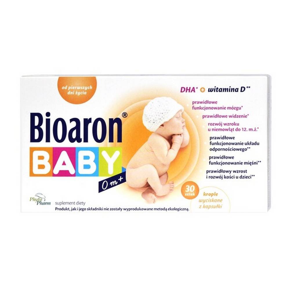 Descripción del producto: Bioaron Baby de 0 m+ aporta al organismo del niño ácidos grasos omega-3 y vitamina D3. Gracias a ello, garantiza su correcto desarrollo y crecimiento. Tiene un efecto positivo en el funcionamiento del cerebro y la vista.