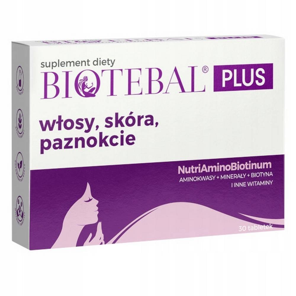 Biotebal PLUS hair, skin, nails is a dietary supplement recommended for everyday support of the condition and appearance of hair, skin and nails. It contains a concentrated, nourishing formula of NutriAminoBiotinum , rich in amino acids, minerals and vitamins – including biotin. Biotebal PLUS hair, skin, nails contains the maximum amount of biotin allowed for use in dietary supplements in Poland (2500 micrograms in a daily dose).