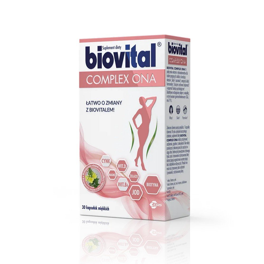 “Biovital Complex Ona is a dietary supplement containing this combination of vitamins and microelements, enriched with evening primrose oil, including gamma-linolenic acid (GLA min. 9%).