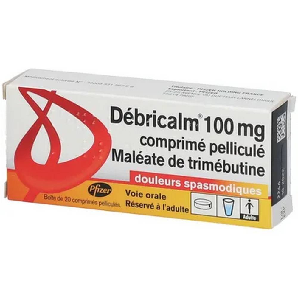 Debricalm est un médicament appartenant à la famille des antispasmodiques à visée digestive, composé de trimébutine. C’est un médicament indiqué chez l’adulte pour le traitement symptomatique des spasmes digestifs ou biliaires. Sous forme de comprimé pelliculé : Maléate de trimébutine 100 mg. Les autres composants sont : Lactose monohydraté, amidon prégélatinisé, hypromellose, carboxyméthylamidon sodique, acide tartrique, colloïdal. silice anhydre, stéarate de magnésium.