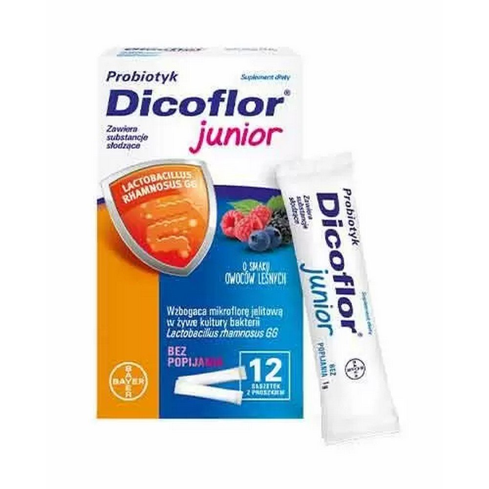 Le complément alimentaire probiotique Dicoflor Junior contient des cultures vivantes de bactéries Lactobacillus rhamnosus GG pour compléter la microflore bactérienne du système digestif. Le produit peut être utilisé après une antibiothérapie, une diarrhée et des problèmes du système digestif. À utiliser chez les adultes et les enfants de plus de 3 ans. Le goût des fruits des bois.
