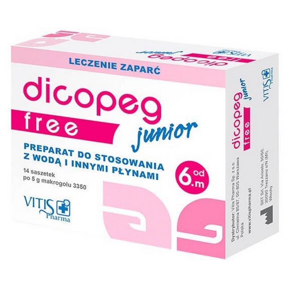 Dicopeg Junior Free es un dispositivo médico en forma de polvo destinado al tratamiento del estreñimiento en niños a partir de los 6 meses de edad. 1 sobre del preparado contiene 5g de macrogol 3350. El preparado para uso con agua u otros líquidos está especialmente recomendado en caso de estreñimiento crónico y trastornos intestinales ocasionales. El producto tiene un efecto laxante osmótico, que se basa en la regulación natural de los intestinos. Gracias a sus propiedades hidrofílicas, Dicopeg Junior Free ablanda las heces, facilitando la defecación, sin causar calambres, dolor abdominal o presión brusca. La eficacia del producto no disminuye con el tiempo. El producto no se absorbe y no fermenta en los intestinos y no irrita las membranas mucosas. Se excreta sin cambios en las heces.