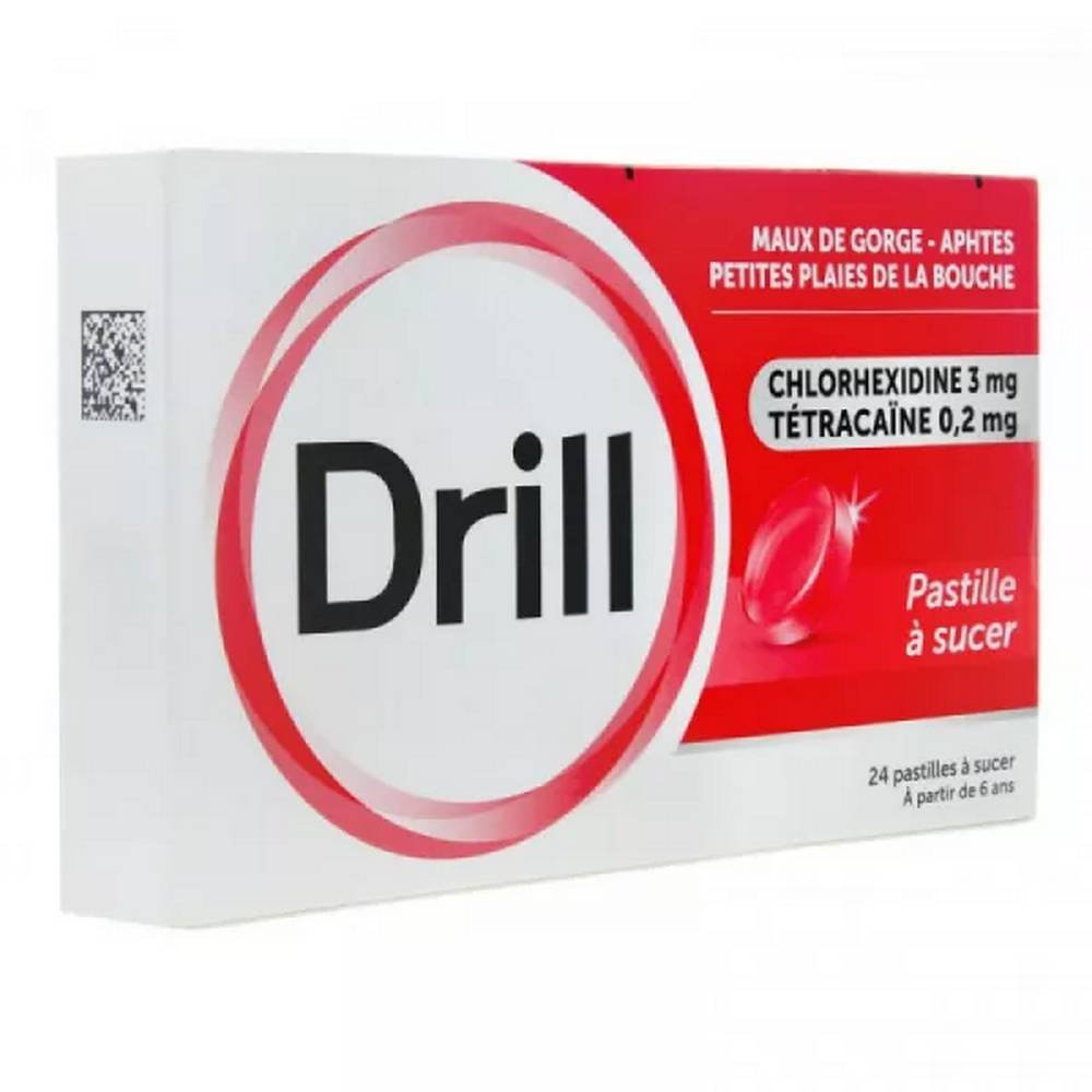 содержат комбинацию двух активных ингредиентов. Сначала местный анестетик тетракаина гидрохлорид в дозе 0,2 мг, а затем местный антисептик хлоргексидина глюконат из расчета 3 мг на пастилку. Для завершения формулы каждой пастилки для горла Drill в качестве вспомогательных веществ используются следующие вспомогательные вещества: аскорбиновая кислота, маковый вкус (алкоголиты вишни и малины; спирты вишни, малины, почек черной смородины, плодов черной смородины, ванильные алкоголяты; эфирные масла, включая горький миндаль, винный осадок, апельсин, розу; ароматические гиперконцентраты, такие как абсолюты и конкреты, включая ваниль, жасмин, ирис, листья фиалки, сахароза), пульморальный ароматизатор (ментол, эфирное масло эвкалипта, тимол, терпинеол), глицирризат аммония, кошениль красный А, безводная глюкоза, сахароза.