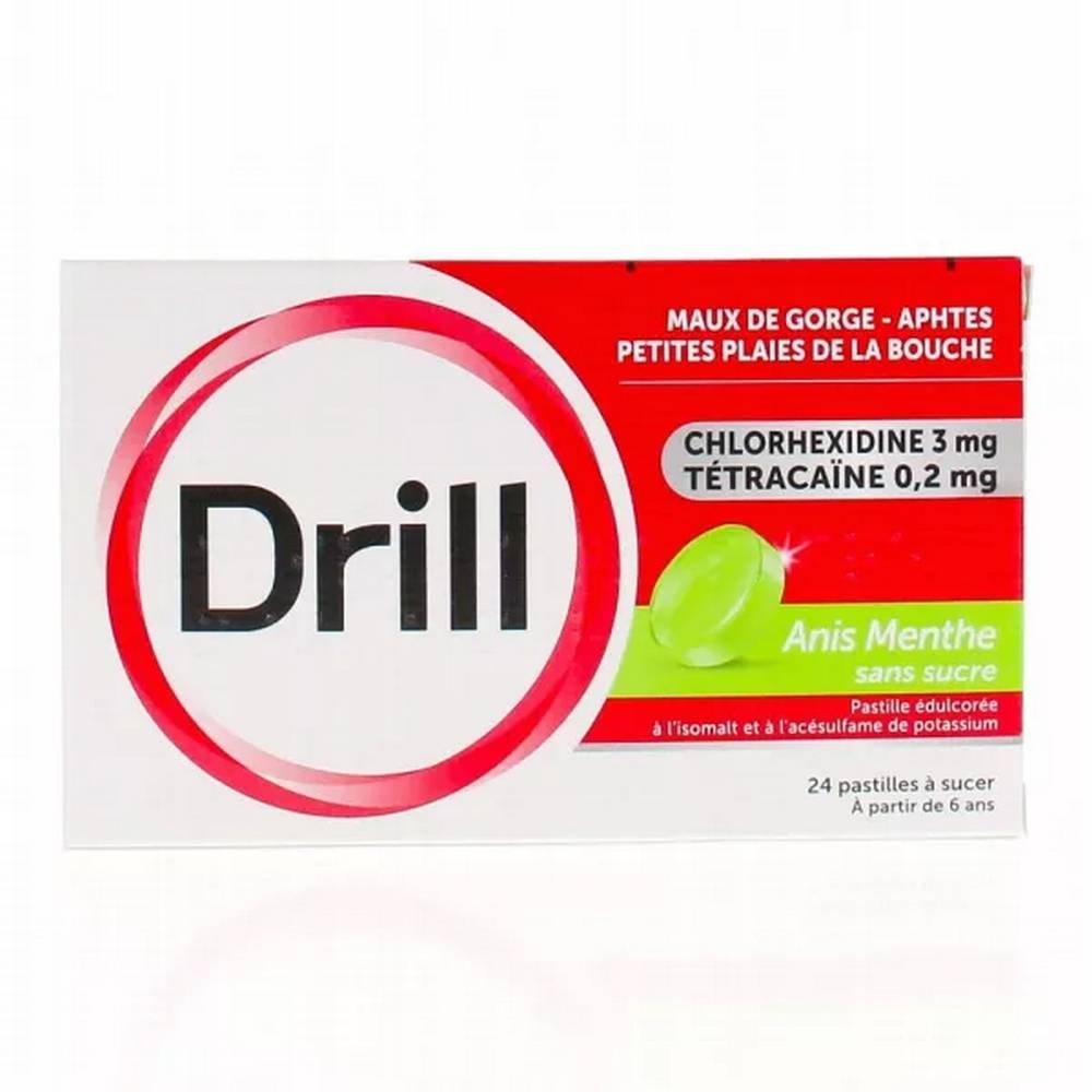 Les pastilles Drill au goût d’anis et de menthe sont des médicaments sans ordonnance qui se prennent dès les premiers symptômes de  ;mal de gorge , aphtes ou< span> petites plaies dans la bouche . Ils sont conçus pour soulager l’inconfort grâce à la présence dans leur formule de digluconate de chlorhexidine à raison de 3 mg et de chlorhydrate de tétracaïne à raison de 0,20 mg par pastille de 2,5 g. L’excipient connu de ce médicament est l’Isomalt (E953). Les pastilles Drill anis menthe sans sucre conviennent aux diabétiques.