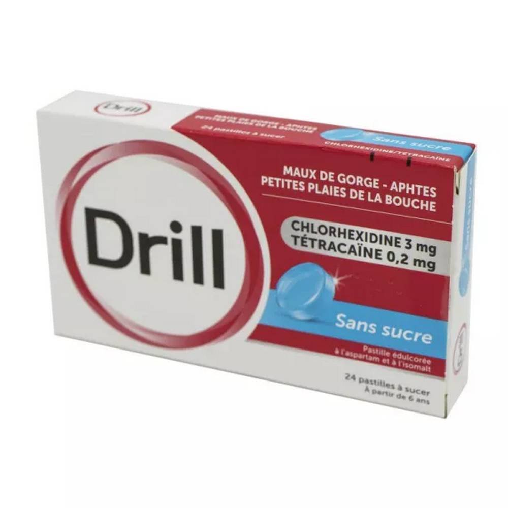 Les pastilles sans sucre Drill sont un médicament composé d’un anesthésique  et un antiseptique . Il est utilisé pour traiter les maux de gorge quand ils sont légers et sans fièvre. Il est également indiqué pour traiter les ulcères buccaux etles petits  plaies dans la bouche . Son utilisation doit être de courte durée (5 jours), et est réservée aux adultes et aux enfants de plus de 6 ans.
