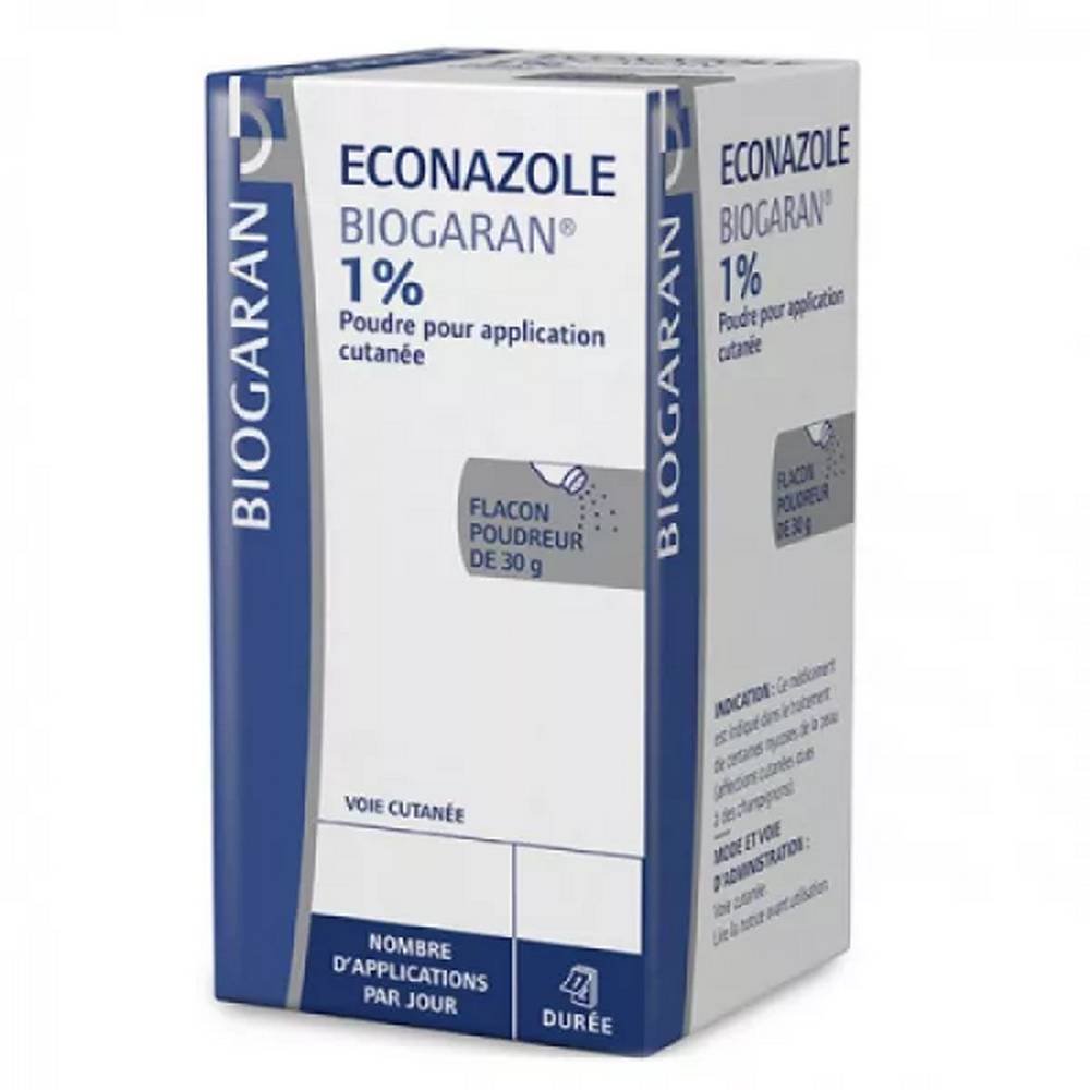 Эконазол 1% Биогаран порошок является противогрибковым препаратом местного действия, который может лечить определенные  микозы кожи , в том числе грибы семейства имидазолов. Показан при кандидозе и дерматофитиях. Его действующее вещество — эконазола нитрат в дозе 1%, или 1 г на 100 г, что соответствует 0,86 г основного эконазола. Прочие ингредиенты: тальк, безводный коллоидный диоксид кремния (АЭРОСИЛ 300) и оксид цинка.