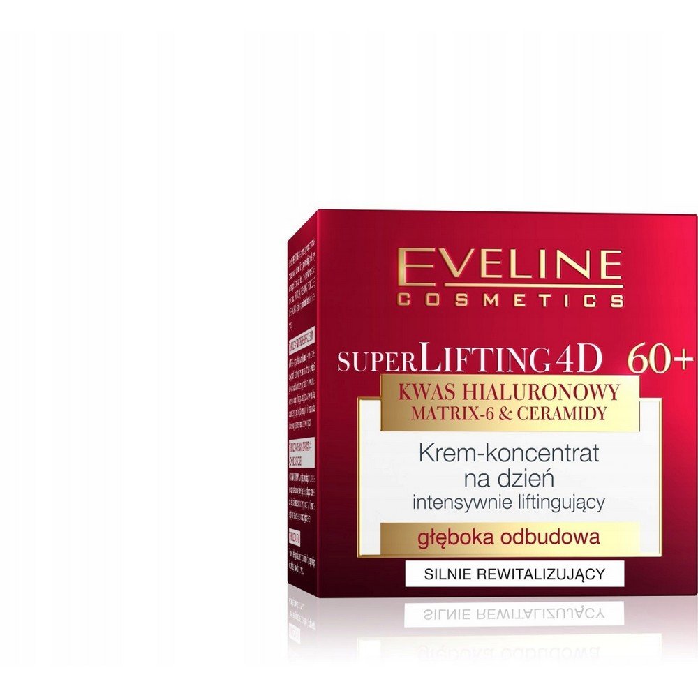 EVELINE LIFTING 4D 60+ DAY CREAM is an advanced product designed for daily skin care for people over 60 years of age. This cream concentrate is created for intensive regeneration and deep reconstruction of the skin, while providing a lifting effect. One of the key ingredients of this cream is hyaluronic acid, which perfectly moisturizes and smoothes the skin, giving it a healthy and youthful appearance. Hyaluronic acid also acts as a natural wrinkle filler, reducing the appearance of fine lines and wrinkles. Matrix-6 and ceramides are other valuable substances contained in this product. Matrix-6 is a complex of peptides that act at the cellular level, stimulating the production of collagen and elastin. It helps improve the firmness and elasticity of the skin. Ceramides are responsible for strengthening the lipid barrier of the epidermis, protecting it from moisture loss and environmental factors. The effectiveness of this cream is confirmed by dermatological tests. After just a few weeks of regular use, you will be able to notice a visible improvement in the condition of your skin. The skin becomes more toned, elastic and nourished. EVELINE LIFTING 4D DAY CREAM 60+ is a unique product that meets the needs of mature skin. Its unique combination of active ingredients provides comprehensive care, regenerating and revitalizing the skin on many levels. Restores youthful radiance and reduces the appearance of signs of skin aging. Trust the professional formula of this cream and enjoy more beautiful and healthy skin every day!”