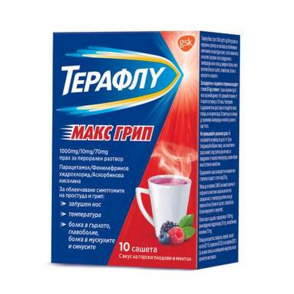 - es un medicamento con paracetamol, que se vende sin receta médica, para aliviar los síntomas de la gripe y la tos. Los demás principios activos del producto son clorhidrato de fenilefrina y guaifenesina. Teraflu Max alivia los síntomas del resfriado, la gripe y la tos, como el dolor leve a moderado, la fiebre, la congestión nasal y la tos productiva. El medicamento está destinado a adultos, pacientes de edad avanzada y adolescentes a partir de 16 años, con un peso corporal de 50 kg o más. Se presenta en forma de monodosis en sobres, para preparar fácilmente una bebida caliente.