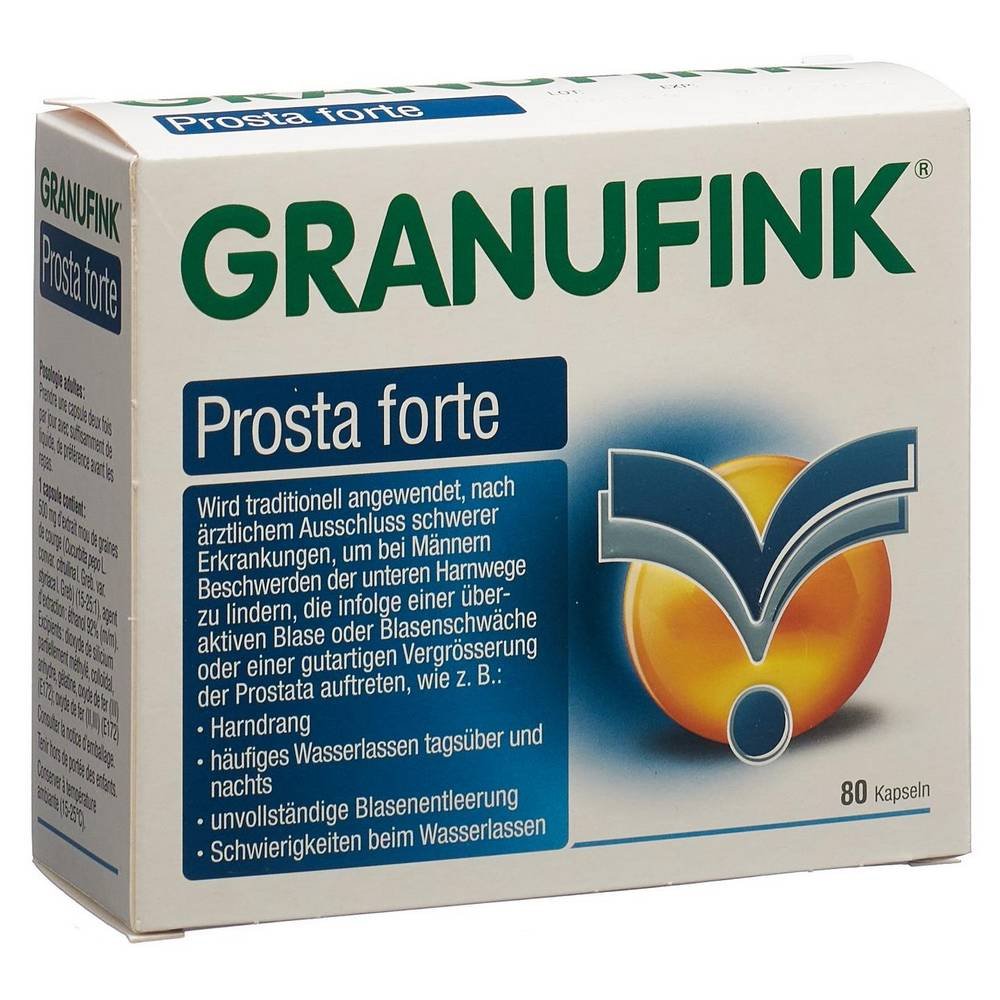 Твердые капсулы GRANU FINK Prosta forte содержат густой экстракт семян тыквы в качестве активного ингредиента. Семена получены из сортов тыквы, выведенных специально для медицинских целей, и содержат большое количество дельта-7 стеролов. Они активны в отношении простаты и действуют аналогично собственным гормонам организма, которые подавляют рост простаты. GRANU FINK Prosta forte снижает нагрузку на систему мочевой пузырь-простата при легких и умеренных жалобах, уменьшая чрезмерное мочеиспускание и увеличивая Струя мочи.