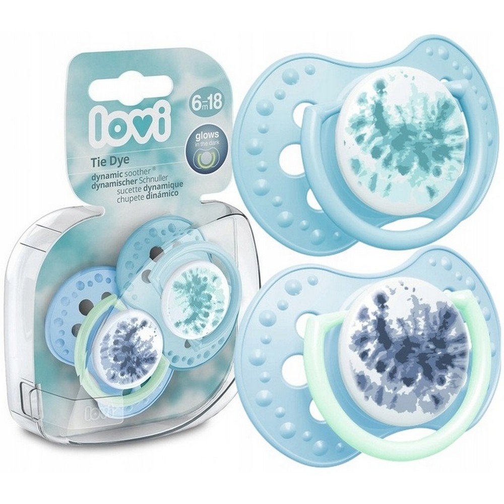 Colorful tie-dye soothers designed for babies 6-18 months, promoting oral development and comfort. Made from safe, BPA-free materials.