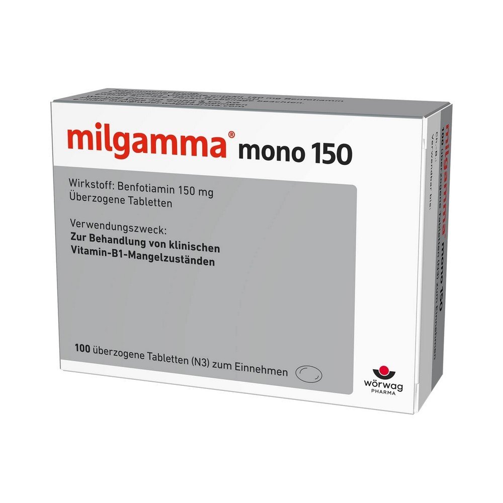 milgamma® Mono 150. Principio activo: Benfotiamina 150 mg. Áreas de aplicación: Terapia o profilaxis de estados clínicos de deficiencia de vitamina B1, siempre que no puedan remediarse; Tratamiento de neuropatías y cardiovasculaturas. Sturgeon., D. puede ser causada por deficiencia de vitamina B1. Lea el suplemento del envase y pregunte a su médico o farmacéutico sobre los riesgos y efectos secundarios.