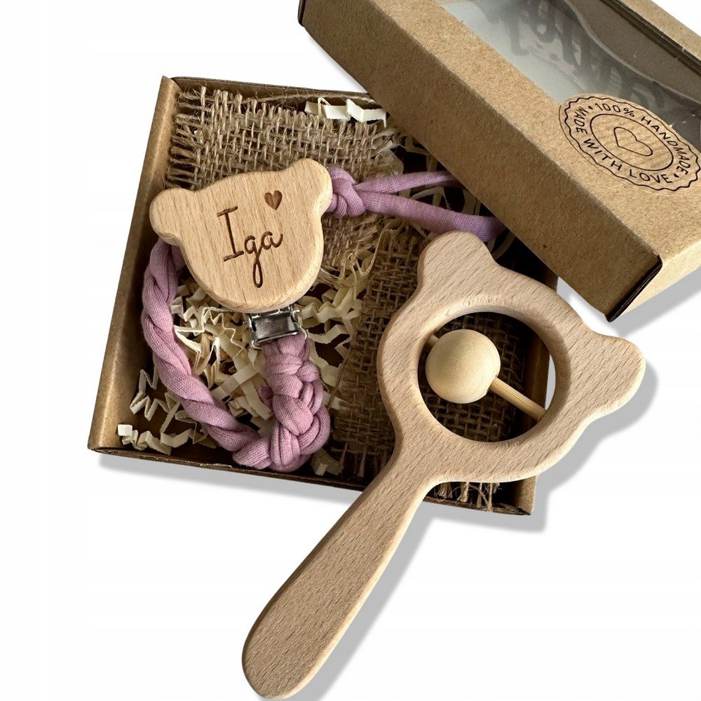 Pendentif factice en osier personnalisé avec gravure sur le nom associé à un adorable hochet de douche de bébé. Parfait pour les cadeaux et la sécurité des sucettes.