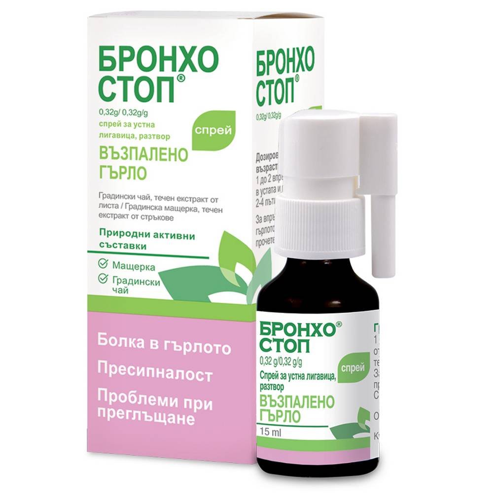 • Bronchostop Spray es un medicamento para el tratamiento de inflamaciones de boca y garganta como dolor de garganta, ronquera y problemas de deglución debidos a resfriados. Contiene extracto de tomillo y salvia. Los aceites esenciales de los principios activos tienen un efecto desinfectante. Los taninos de los principios activos tienen un efecto astringente y antiinflamatorio local.