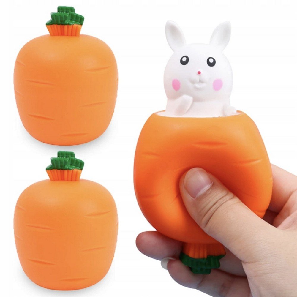 Soft, squeezable rabbit-shaped carrot toy designed for stress relief and sensory fun.