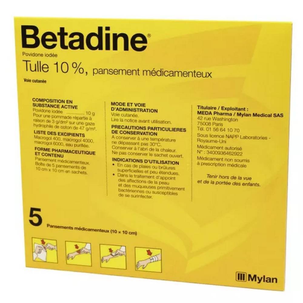 Tul Betadinees un apósito medicinal a base de yodo. Está elaborado con tul gras impregnado con povidona yodada al 10%, formando una pomada distribuida a razón de 3 g/dm 2  sobre una gasa de algodón hidrofílica de 47 g/m 2 .