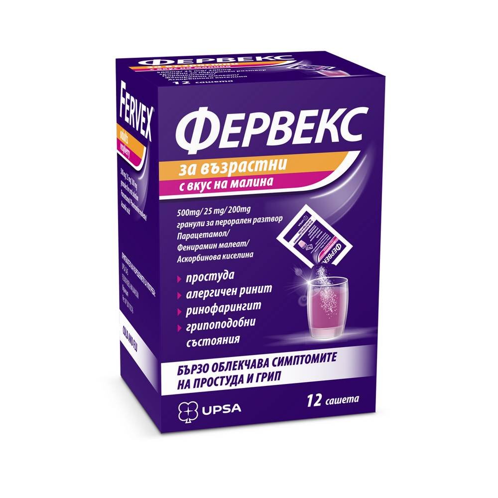 UPSA FERVEX frambuesa 500mg/25mg/200mg, UPSA FERVEX raspberry 500mg/25mg/200mg, 12
