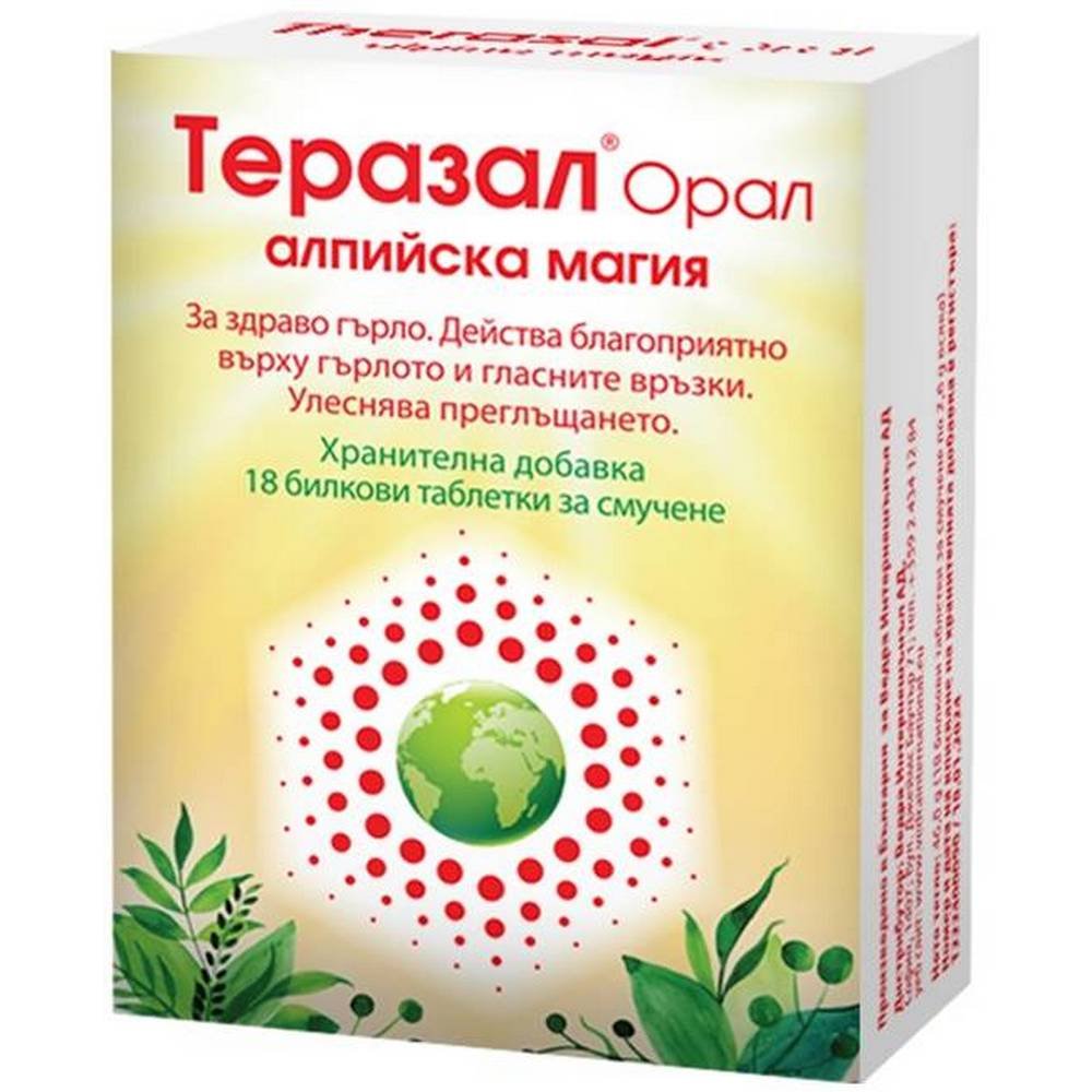 - Teresal Oral — это диетическая добавка, разработанная для поддержания здоровья горла и голосовых связок, обеспечивающая быстрое и эффективное облегчение и легкость глотания. Она содержит натуральные масла и растительные экстракты, которые оказывают благотворное воздействие на слизистую оболочку полости рта, поддерживают ее увлажненной, поддерживают иммунитет полости рта и оказывают регенерирующее действие для успешной борьбы с раздражениями. В сочетании с добавленным витамином С и его антиоксидантными свойствами иммуностимулирующее действие продукта дополняется для сильной и эффективной защиты первой линии организма — верхних дыхательных путей. Формула создана с вниманием и заботой о голосовых связках, помогая восстановить голос после чрезмерного напряжения или воспаления.