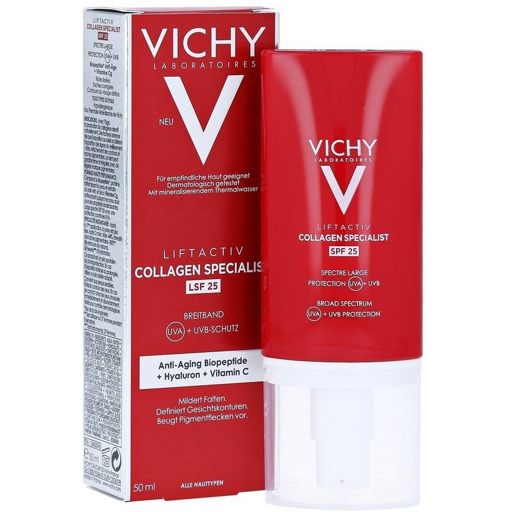 С возрастом выработка коллагена естественным образом замедляется. Внешние факторы, такие как пребывание на солнце, ускоряют появление признаков старения – морщин, размытости контуров лица и изменения цвета. Крем Liftactiv Collagen Specialist SPF 25, который разглаживает морщины, уменьшает пигментацию и моделирует контур лица. В то же время он помогает защитить кожу от новых морщин, вызванных воздействием UVA-излучения, благодаря защите SPF 25 широкого спектра. Формула содержит биопептид против морщин, полученный из зеленого горошка, который уменьшает признаки потери коллагена в коже. Витамин Cg обладает антиоксидантными свойствами и выравнивает тон кожи. Термальная вода Виши, богатая 15 ценными минералами, поддерживает естественные защитные механизмы кожи, что подтверждено клиническими исследованиями. Крем также обогащен гиалуроновой кислотой, которая увлажняет и разглаживает поверхность кожи.