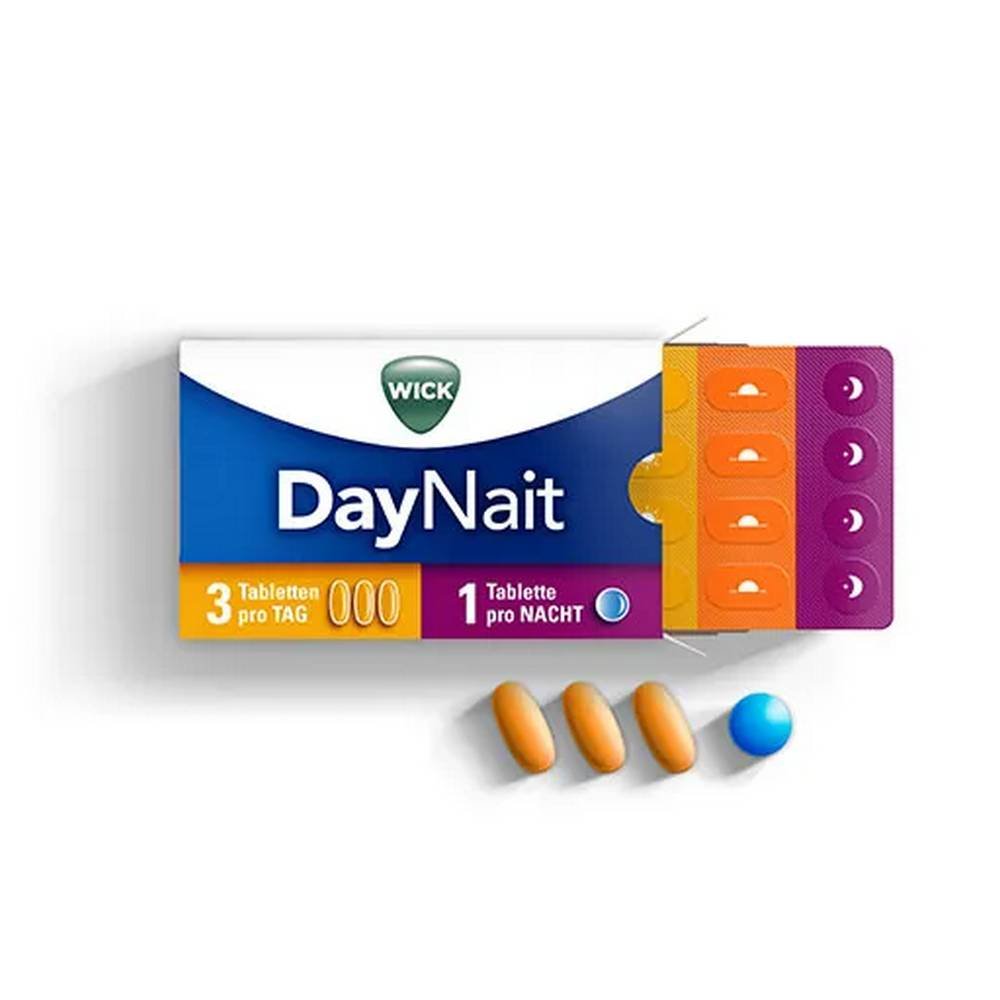 Wick DayNait is a dual-action cold and flu medicine formulated to relieve symptoms of both day and night discomfort.