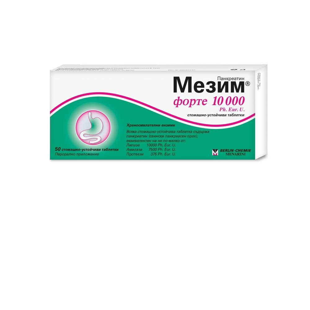- Mezim ® forte 10000 Ph. Eur. U. est un médicament contenant des substances (enzymes) issues du pancréas de porc (poudre pancréatique, également appelée pancréatine) qui facilitent la digestion.
