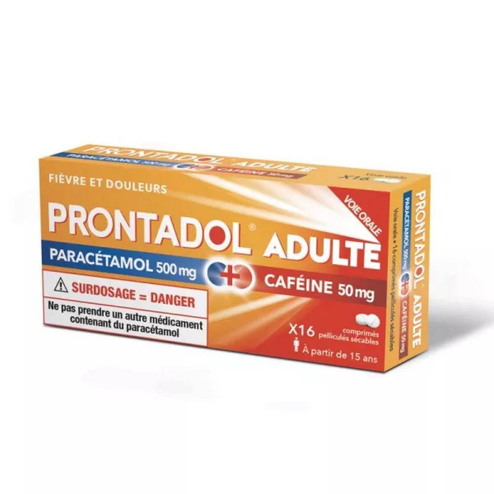 Prontadol adulte les comprimés contiennent 500 mg de paracétamol  et 50 mg de caféine . Ce médicament est un analgésique périphériqueanalgésique et antipyrétique , disponible sans ordonnance. Il est indiqué en cas de fièvre et/ou de douleurs telles que maux de tête, syndromes grippaux, douleurs dentaires, courbatures, règles douloureuses.